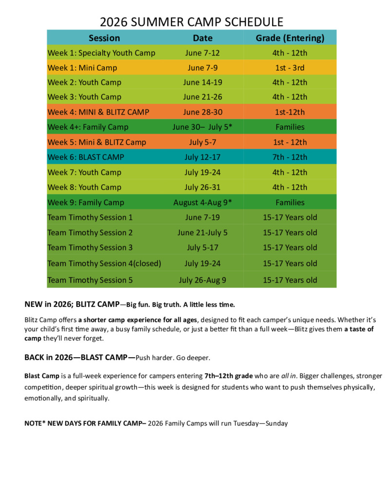 Come discover the endless options for adventure, Bible study, and family bonding. While the kids have Bible Hour and games with our caring summer staff, teens and adults enjoy their own relevant activities. It’s your family vacation, so do as much or as little as you like. Enjoy the family friendly campground atmosphere and create memories together. Click the Register button to make your reservation!