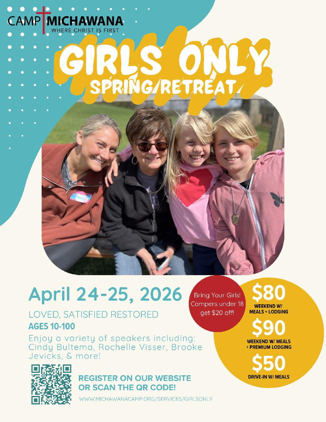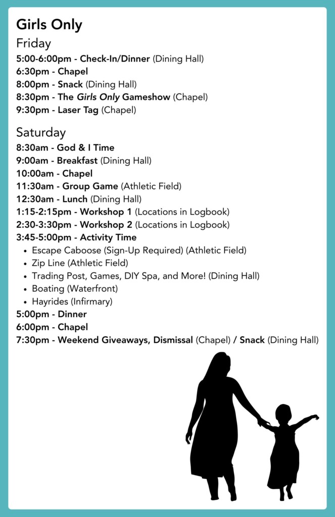 This weekend is designed to enjoy the outdoors, each other, and learn from the truth of God’s Word! Get ready for group games and laughs with chapel sessions filled with worship, fun, and messages for girls and grownups as well as breakouts just for kids, teens, and adults!