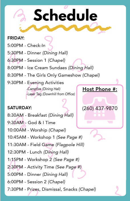 We love our Girls Only Retreat. Its short but so impactful. We have provided you with a schedule for the weekend. (subject to adjustments). We are here to answer any questions you may have. We can be reached at 269-804-3470 via phone/text or email: [email protected]
